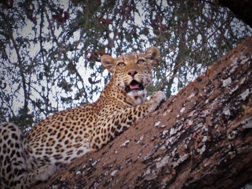 I may be pretty stubborn, but I know that sometimes it is good to listen to others. Had we stayed longer and watched the Painted Dogs we might have missed the lion trying to climb the tree to get to the leopard who was there protecting its kill. In real life the leopard was even more beautiful and more agile than you’d expect, leaping from one branch to another, taunting the lion who just wanted to share in the goods.